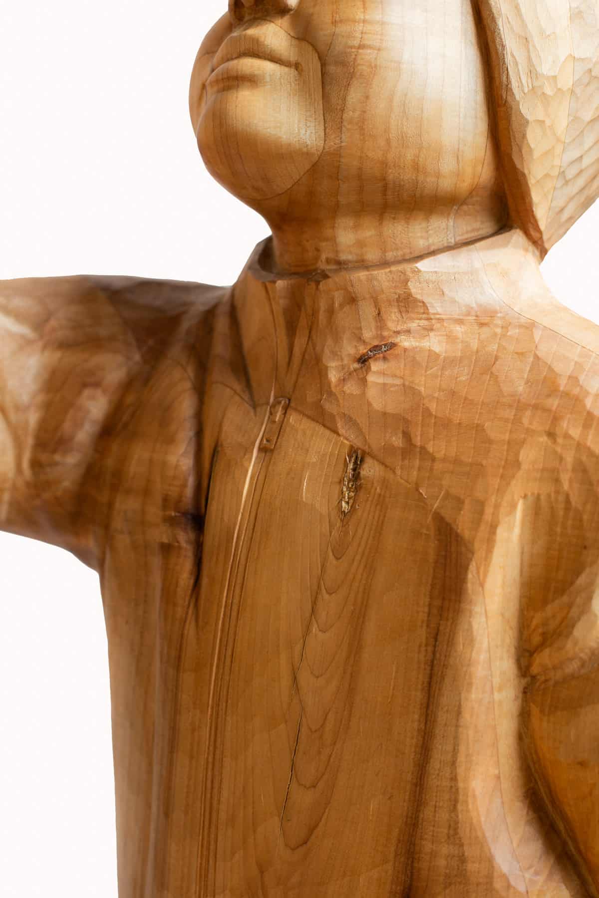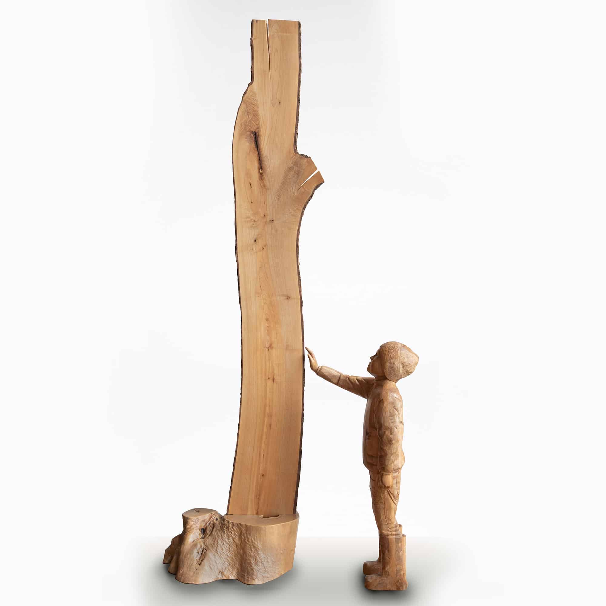 Name: Inside-Out. Material: Salvaged Maple. Dimensions: H: the tree is 275 cm/9′ tall. H: the boy is 108 cm/43″ tall. D: 120 cm/47″ (total depth from the back of the tree to the back of the boy). Taxes are applicable. Shipping and handling/crating charged separately. Please email for shipping quote.